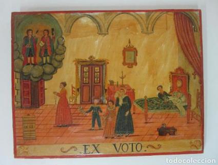 XVII i XIX de la devoció als països mediterranis catòlics, és l’ofrena d’exvots. Aquests són una mostra d’agraïment pel favor rebut, gairebé sempre la curació d’una malaltia, deslliurarse d’un accident o d’una calamitat natural, evitar la mort en cas de naufragi o en una acció bèl·lica o una agressió amb arma. En els exvots (19, 20 i 21) hi ha una part divina, on està representat el sant, la santa o verge a qui s’ha demanat el favor i una part històrica, on es descriu pictòricament d’una manera força naïf, el fet que va justificar el prodigi. Les verges o els sants representats als exvots són habitualment els que tenen més fidels, més devots, en l’àrea de residència de qui fa l’ofrena de l’exvot.