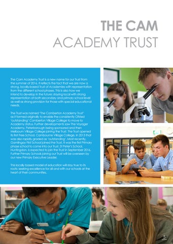 THE CAM ACADEMY TRUST The Cam Academy Trust is a new name for our Trust from the summer of 2016. It reflects the fact that we are now a strong, locally-based Trust of Academies with representation from the different school phases. This is also how we intend to develop in the future: staying local with strong representation at both secondary and primary school level as well as strong provision for those with special educational needs. The Trust was named ‘The Comberton Academy Trust’ as it formed originally to enable the consistently Ofsted ‘outstanding’ Comberton Village College to move to Academy status. Further developments saw The Voyager Academy, Peterborough being sponsored and then Melbourn Village College joining the Trust. The Trust opened its first Free School, Cambourne Village College, in 2013 that was also rapidly graded as ‘outstanding’. Most recently, Gamlingay First School joined the Trust. It was the first Primary phase school to come into our Trust. St Peter’s School, Huntingdon, is expected to join the Trust in September 2016. Further Primary Schools joining our Trust will be overseen by our new Primary Executive Leader. This locally based model of education will stay true to its roots: seeking excellence for all and with our schools at the heart of their communities.