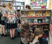 HELP: The fully accessible third CVC bus is in the colours of the main sponsor, and (above) some of the bonus book donation