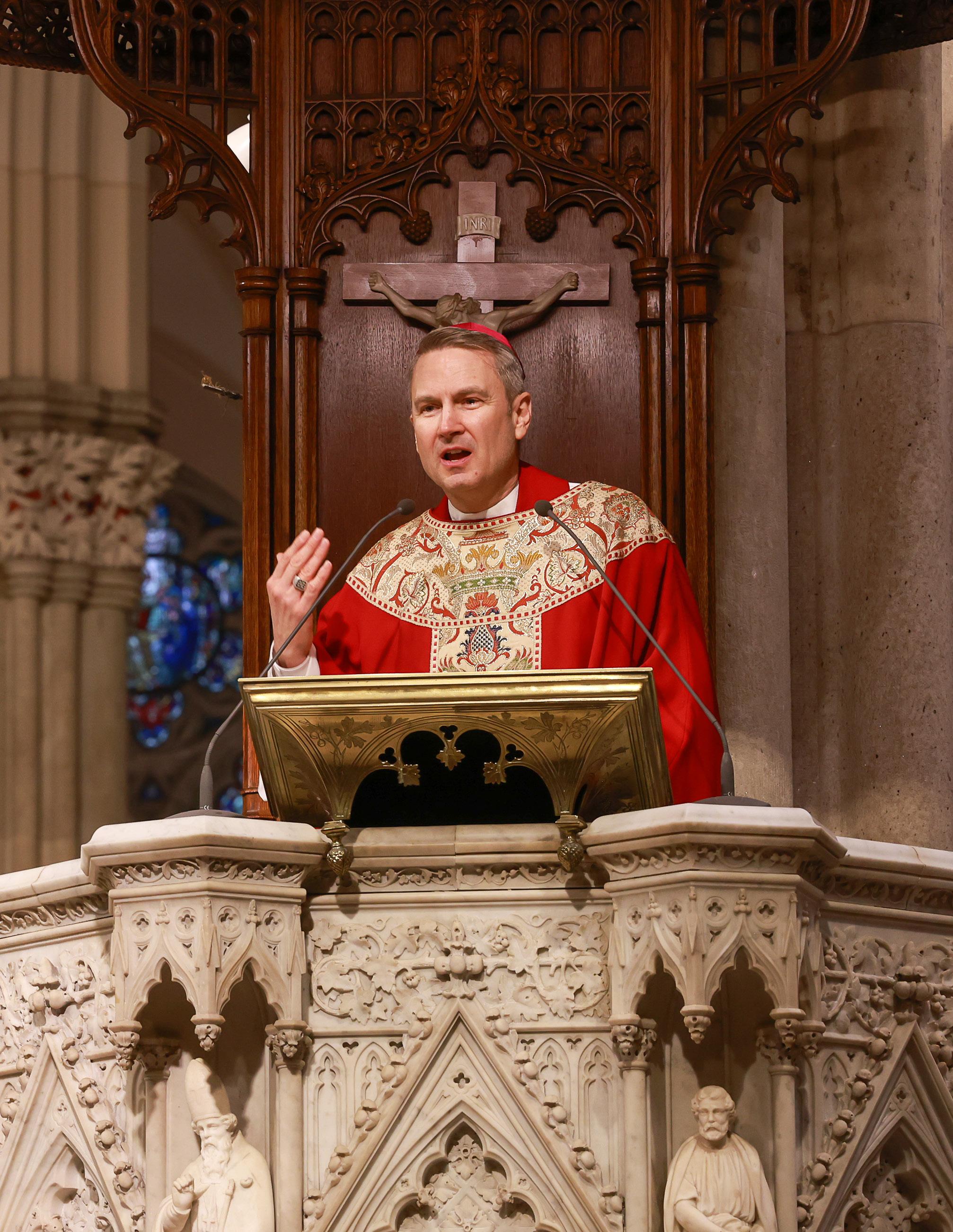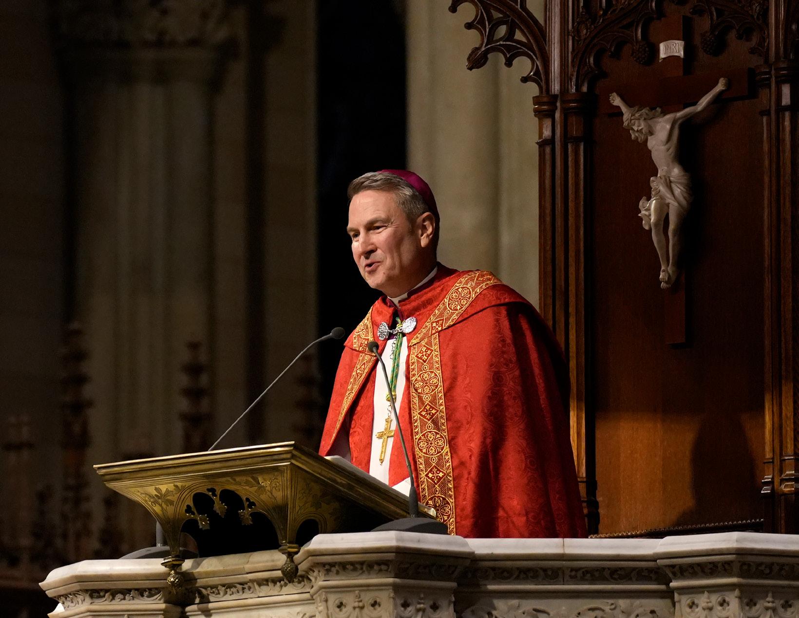 El arzobispo designado añadió: “Amigos, familia, no quiero ser Atlas. No quiero pretender que puedo llevar el peso de esta arquidiócesis sobre mis propios hombros. En cambio, con ustedes, juntos, pongamos la Arquidiócesis de Nueva York, con todas nuestras esperanzas en las manos de Jesús”. Pidió a los fieles que rezaran por él y afirmó que siempre rezaría por ellos. Su homilía fue recibida con aplausos.
