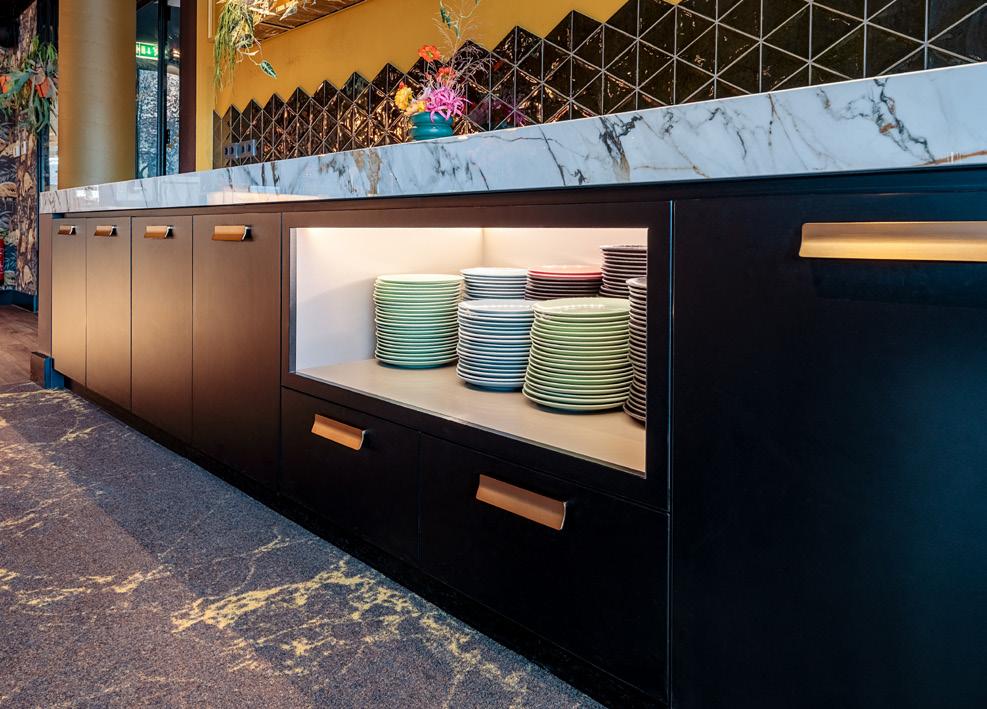 Voor zowel MOJO Amsterdam als Utrecht verzorgde Interemm het volledige interieur, van wanden en zitplekken tot sfeerbepalende details. “Behalve de keuken is alles door Interemm op maat gerealiseerd,” vertelt Yu. “Ze werken nauw samen met onze mensen en begrijpen precies wat we willen.” De samenwerking omschrijft hij als betrouwbaar en professioneel. “Ze denken mee, communiceren duidelijk én leveren topkwaliteit. Experts die leveren wat je voor ogen hebt.”