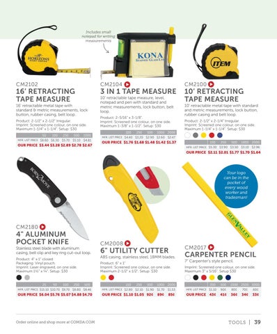 10’ retractable tape measure, level, notepad and pen with standard and metric measurements, lock button, belt loop. Product: 2-5/16" x 3-1/8". Imprint: Screened one colour, on one side. Maximum 1-3/8" x 1-1/2". Setup: $30 1000
