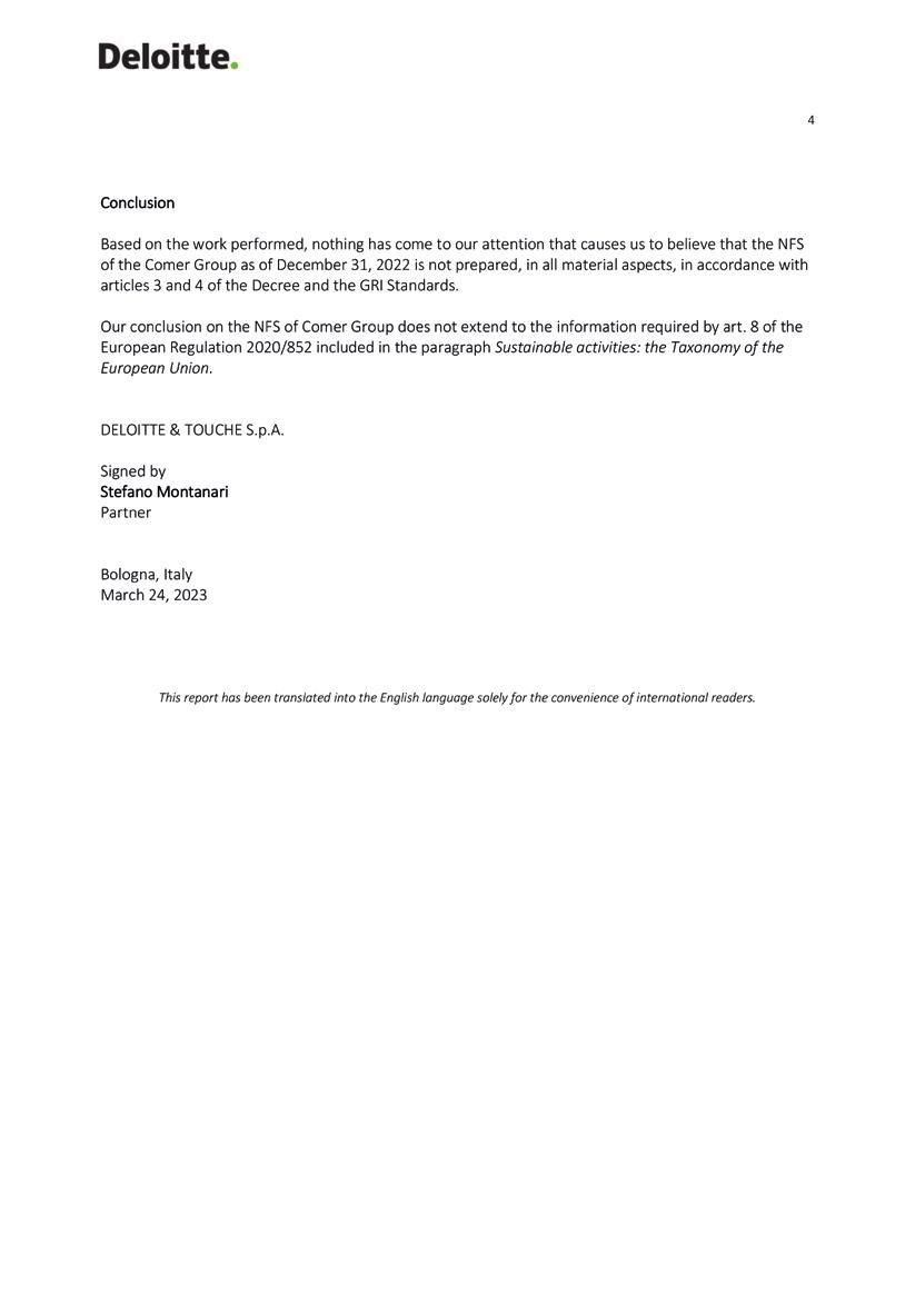 The process of drafting the NFS involved the heads of the various Group departments. The Statement was approved by the Board of Directors of Comer Industries S.p.A. on March 21, 2023 and is the subject of a limited review ("limited assurance engagement" according to the criteria indicated in ISAE 3000 Revised) by Deloitte & Touche S.p.A., which did not extend to the disclosure related to the Taxonomy. The Independent Auditors' Report is included at the end of this document. The NFS can be downloaded from Comer Industries' institutional website in the Comer Industries | Governance | Social responsibility section. For further information, please contact the following email address: sustainability@comerindustries.com