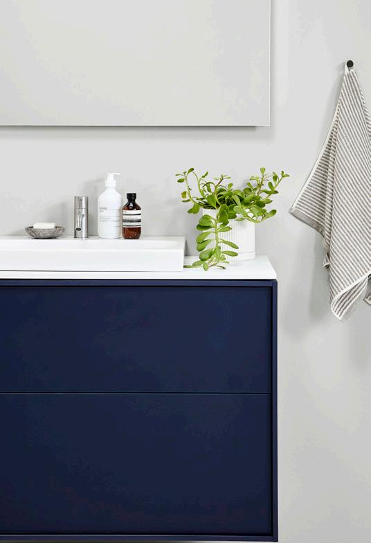 Om du vill ha färg i din badrumsdesign, vad passar då bättre än vattnets egen kulör? Hela rummet är byggt runt vattnets förmåga att hålla oss rena och fräscha.