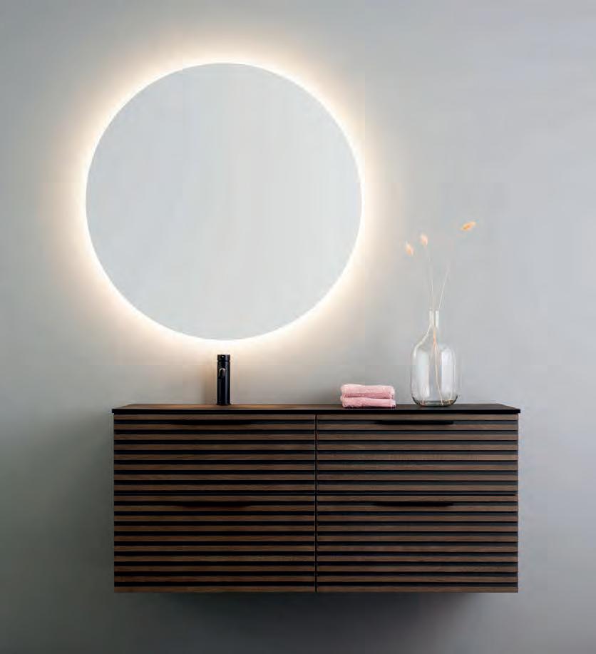 Upptäck vår spegel Vega med sin unika form. Den finns i två storlekar för att passa olika utrymmen och behov. Spegeln kommer med ambilight bakgrundsbelysning. Dimbar. Vega