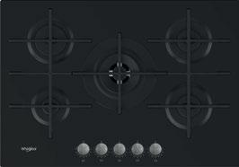 Edzett üveglapon gázfőzőlap, 70 cm, 5 égős (1 WOK égő), 3 öntöttvas edénytartó, frontkapcsolós, egykezes szikragyújtás, teljesítményszabályozás LED kijelzéssel