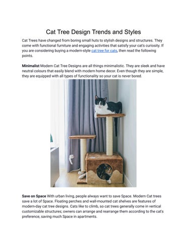 Save on Space With urban living, people always want to save Space. Modern Cat trees save a lot of Space. Floating perches and wall-mounted cat shelves are features of modern-day cat tree designs. Cats like to climb, so cat trees generally come in vertical customizable structures; owners can arrange and rearrange them according to the cat's preference, saving much Space in apartments.