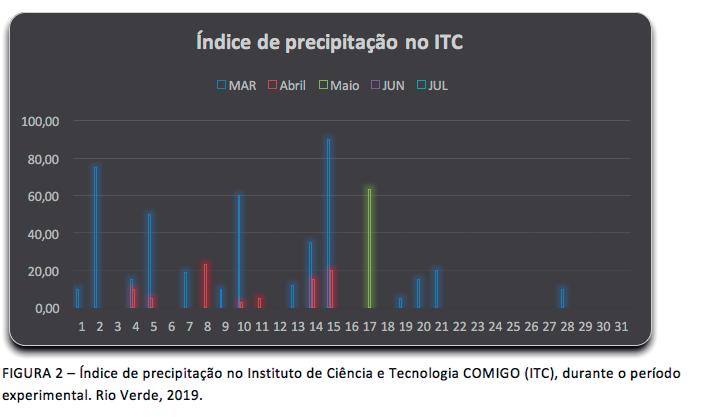Tal condição proporcionou que os animais tivessem desempenhos semelhantes, conforme demonstrado na Tabela 3. Embora com o fornecimento do fertilizante na cobertura, o TCC não apresentou incrementos na produtividade e na composição bromatológica da forrageira. A hipótese a ser considerada foi o momento da realização da adubação em cobertura. A partir do dia (16/04/2019), dois dias antes da aplicação do fertilizante, não houve precipitação, como pode ser demonstrado na Figura 2. Daí em diante, só houve precipitação considerável (63mm), em 17/05/2019 (Figura 2). Isso pode ter influenciado negativamente o aproveitamento