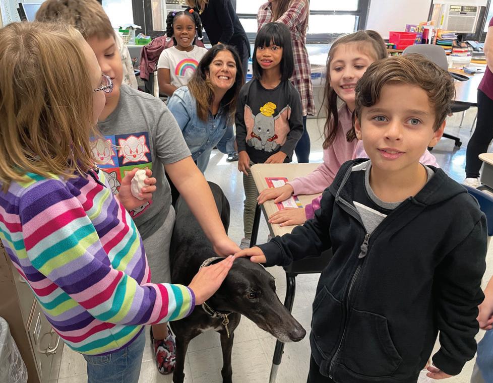 Throughout the fall, third-grade students at Sawmill were visited by a new friend, Valentina. Valentina is a purebred from Therapy Dogs of Long Island. Valentina was a racing dog before her owner adopted her. Research has shown that the mere presence of a therapy dog can decrease anxiety and help students work through social difficulties. The students were able to practice taking turns, display empathy and foster interpersonal skills.
