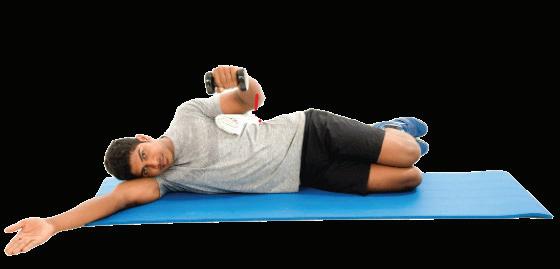 Lie on one side, place a towel roll between elbow and ribs, elbows bent to 90 degrees holding dumbbell (or water bottle) such that fist is towards the floor: