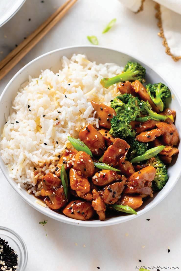 2) In a large skillet or wok over high heat, heat oil. Cook chicken, undisturbed, 1 to 2 minutes. Stir and continue to cook, stirring occasionally, until golden brown on all sides and just cooked through, about 5 minutes more. Transfer to a plate.