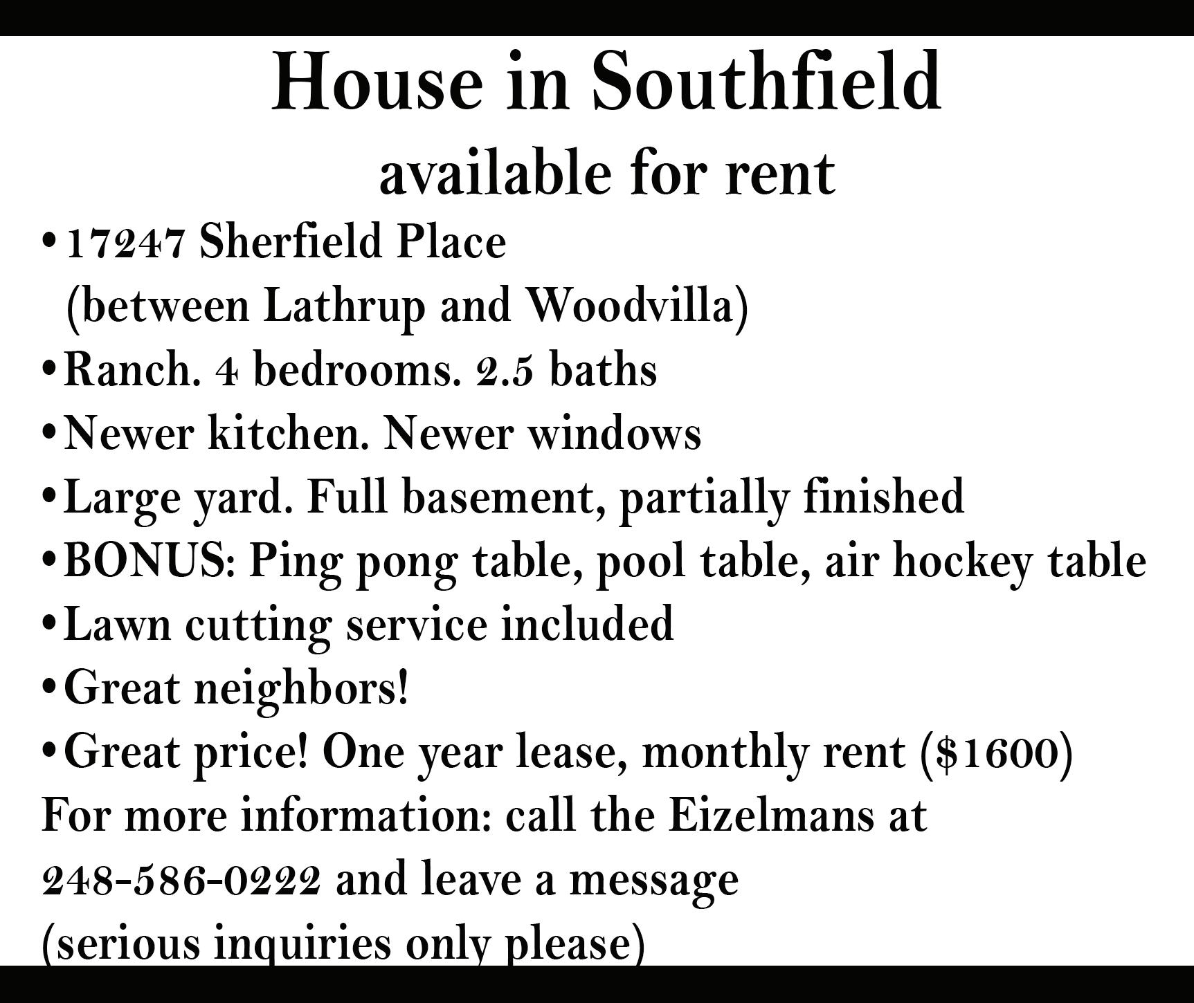 For Rent: North Oak Park 4 bedroom colonial available starting August. Call 248-200-7965 & leave a message.