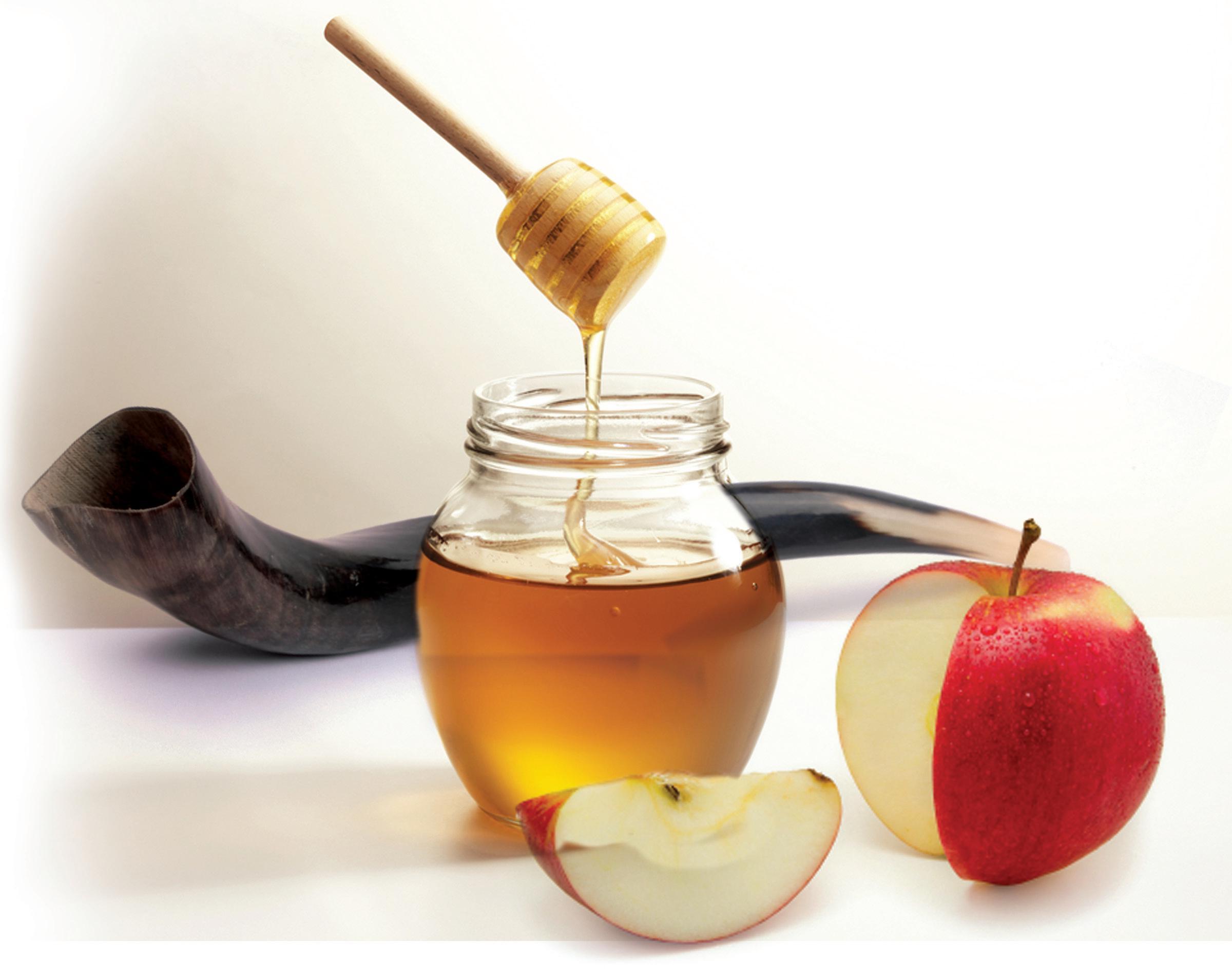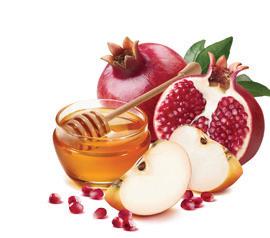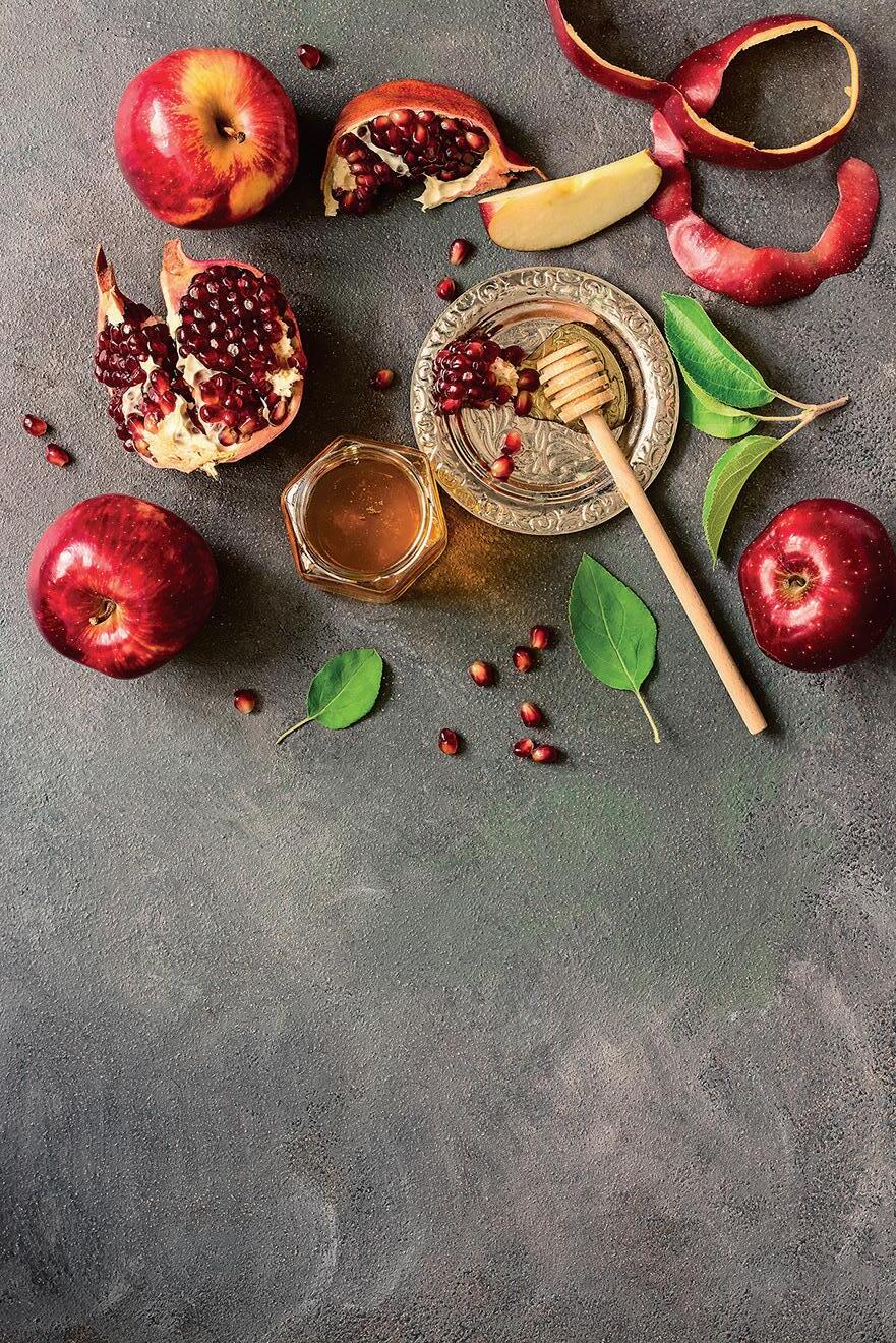 Variety of traditional simanim including apples, honey, pomegranate, carrots, beets, dates, and leeks Gluten Free, Vegetarian