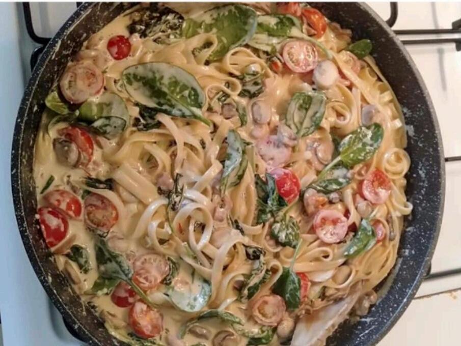 • Add the spinach and sun-dried (or cherry) tomatoes. Cook until the spinach wilts.