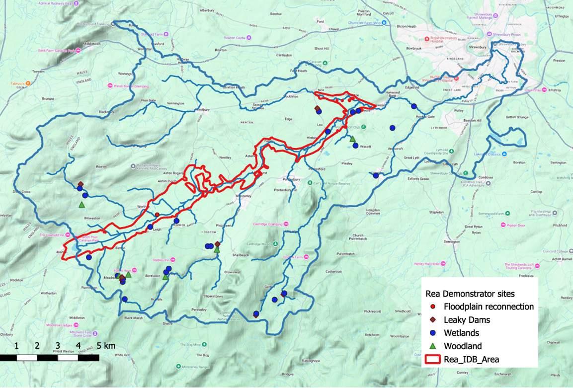 The Rea Brook is a large catchment covering approximately 190km2. It is mainly rural agricultural land, but its lowest reach flows through Shrewsbury to join the River Severn by the English Bridge. It is made up of a wide flood plain flanked by the hills of Long Mountain to the north and the Stiperstones to the south, with a number of tributaries flowing off both sides of these hills. Its source is located in the flood plain at Marton Pool, a designated SSSI and Ramsar site. Villages which suffer flooding are located on all the major tributaries, and the Rea Brook contributes to flooding in the Coleham area of Shrewsbury at its confluence with the Severn.