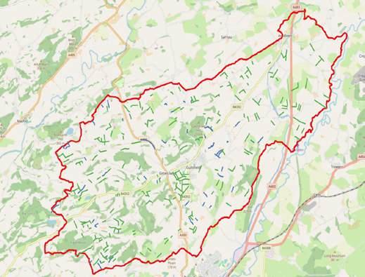 All depleted hedgerows in the Guilsfield Catchment, green shows where hedgerow has been completely removed, blue shows where hedgerow has gaps.