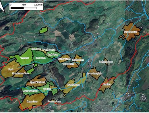 Map showing farms engaged with in the Guilsfield Catchment. Orange shows farms where engagement is complete, green shows farms where work is ongoing