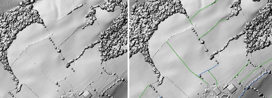Example of hedgerow depletion at farm scale, and how LIDAR shows remnant hedgerows indicated by green and blue lines.