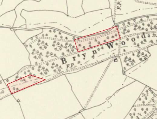 1888-1915 OS map showing historic woodland at Tirnewydd farm. Red polygons show the areas restored as part of the Guilsfield demonstrator.