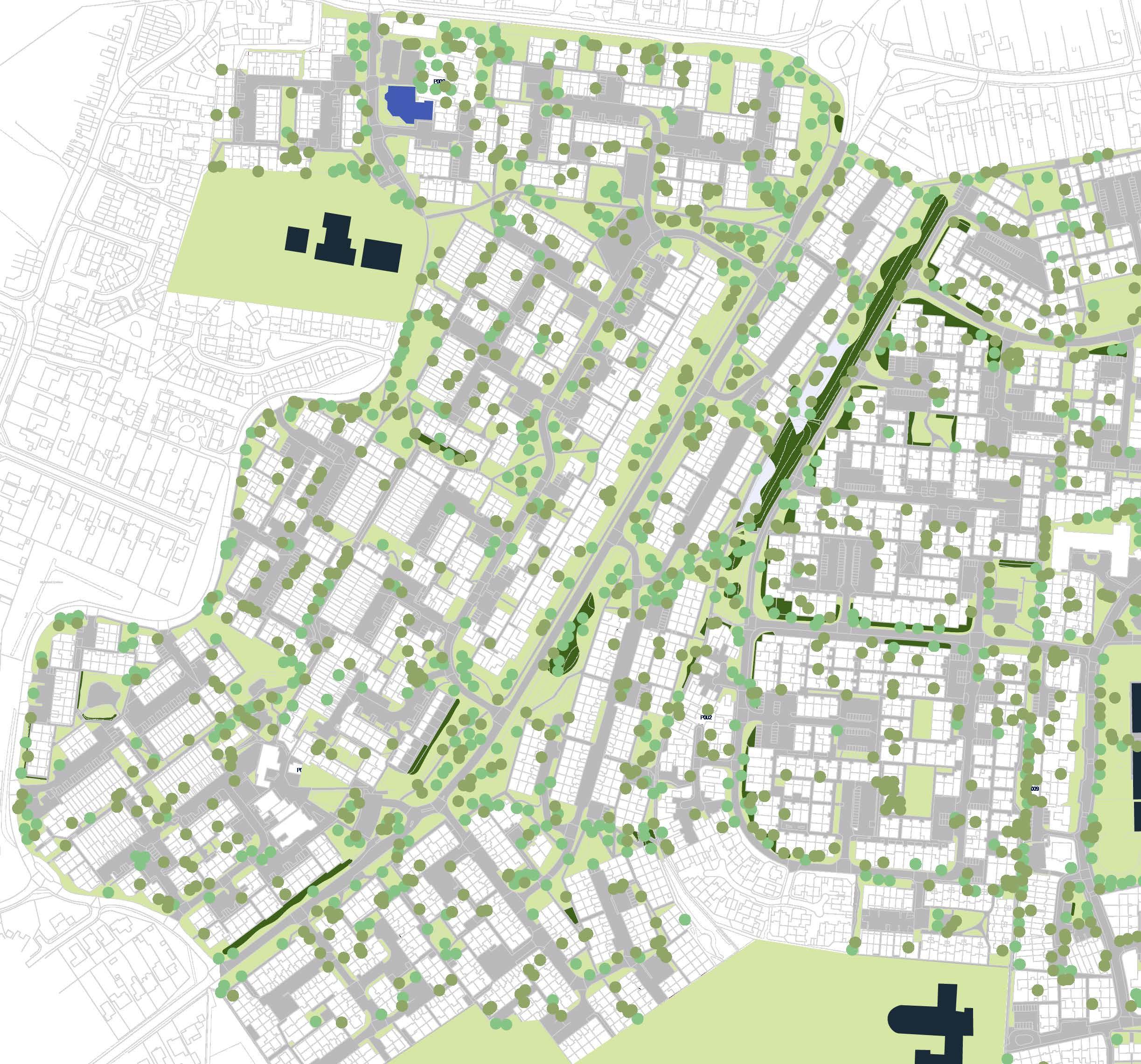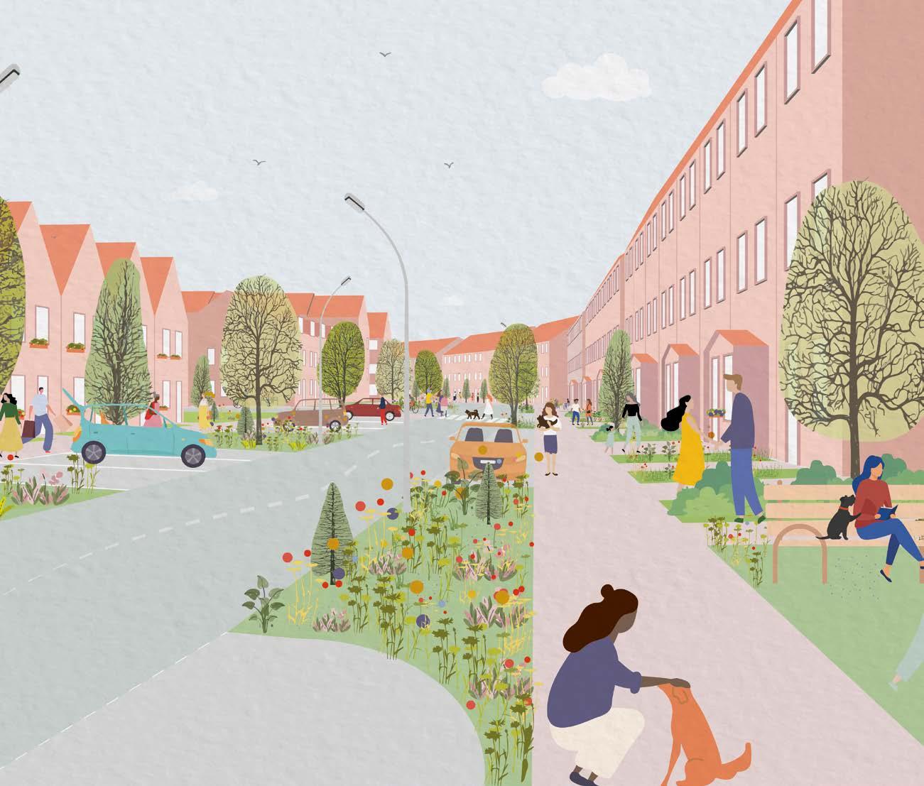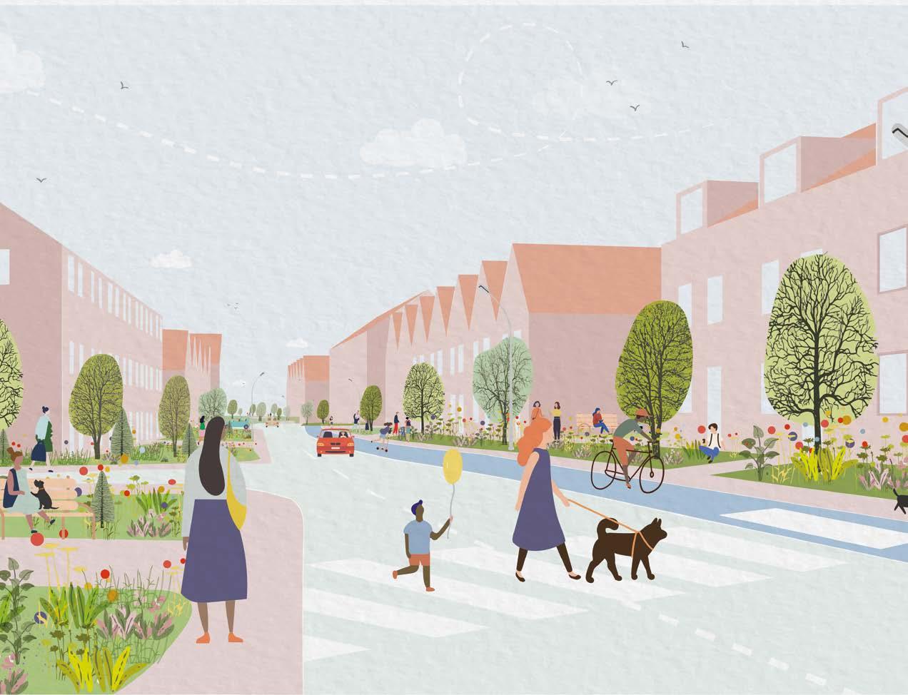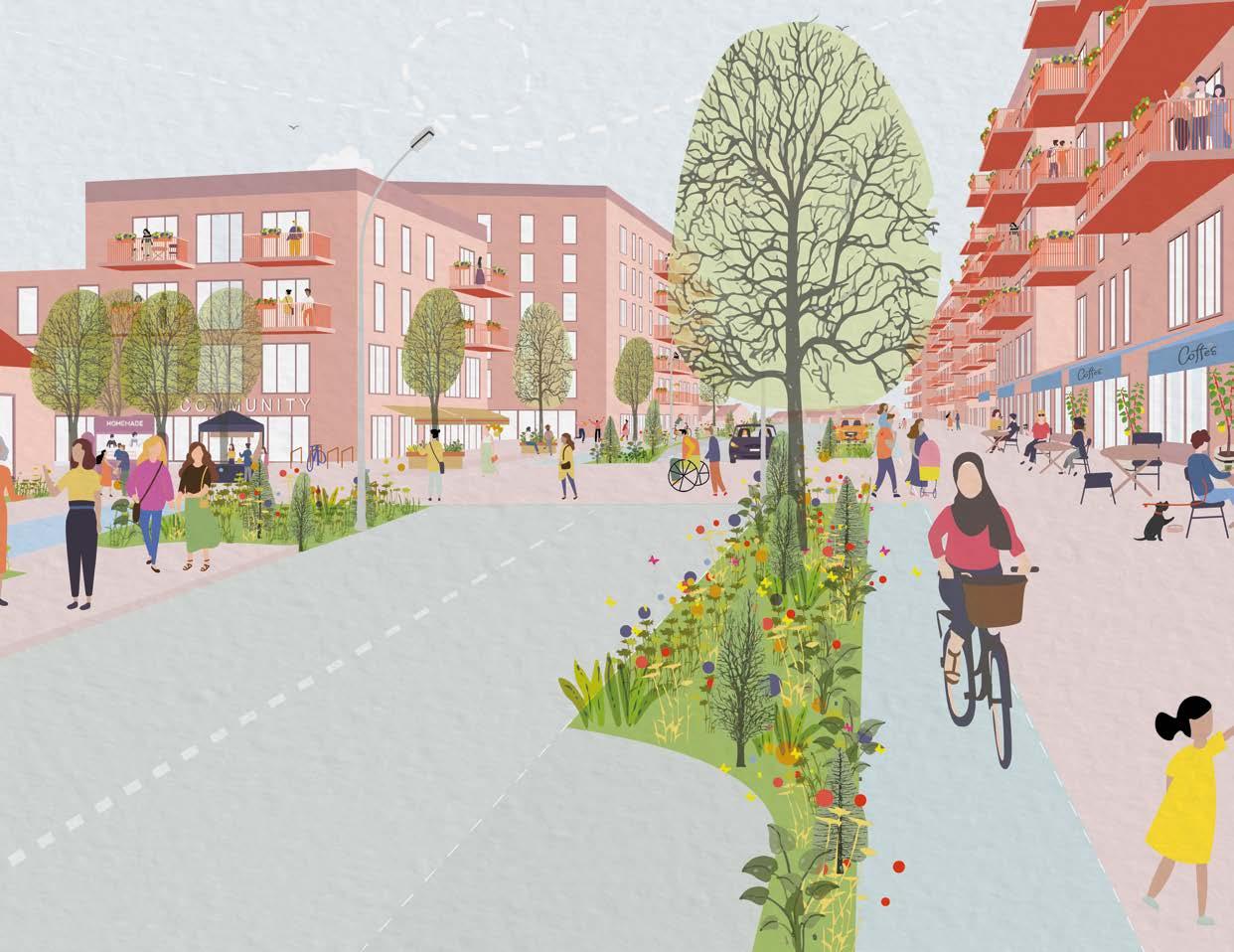 • Green streets throughout with integrated trees, parallel parking, cycle parking and bus stops