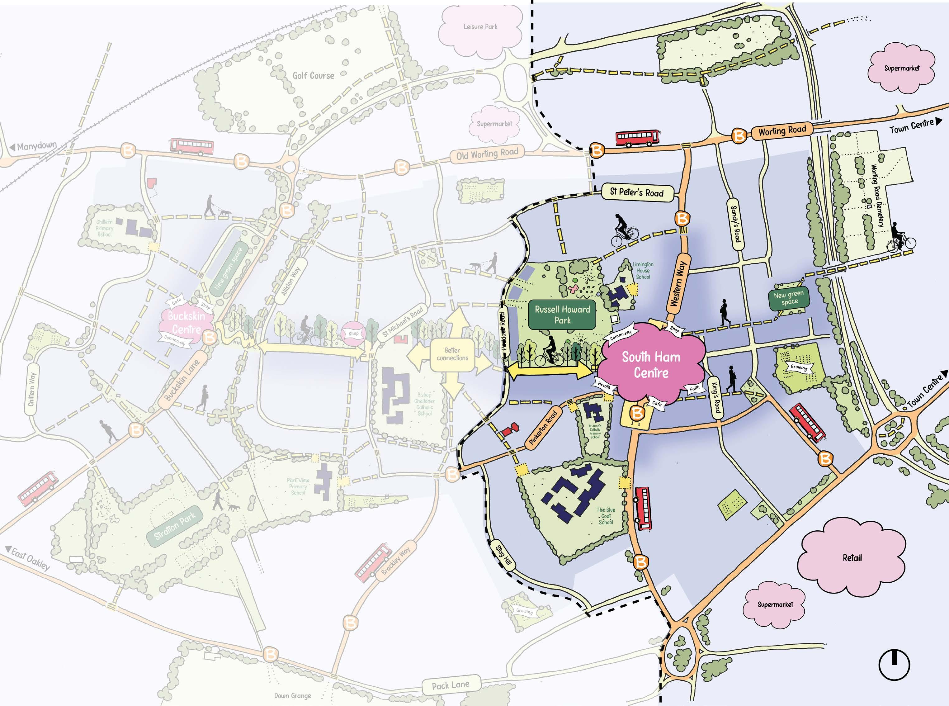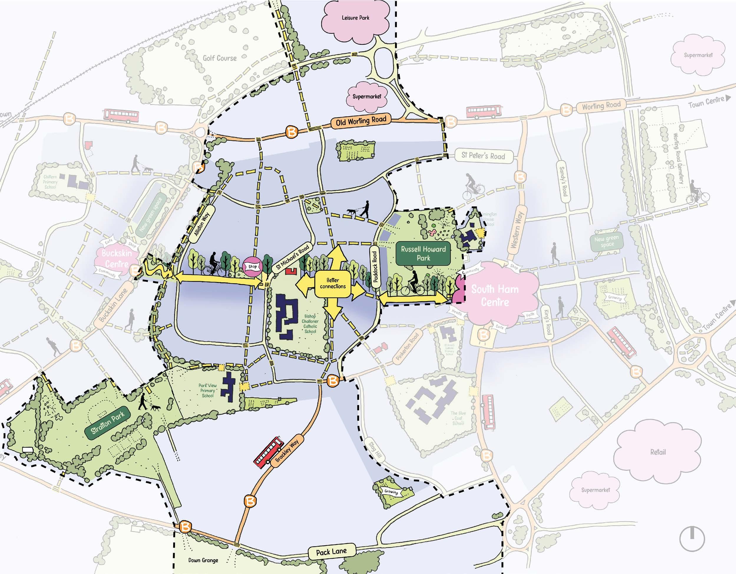 • Improved walking and cycling routes to Manydown and countryside to the west of the neighbourhood