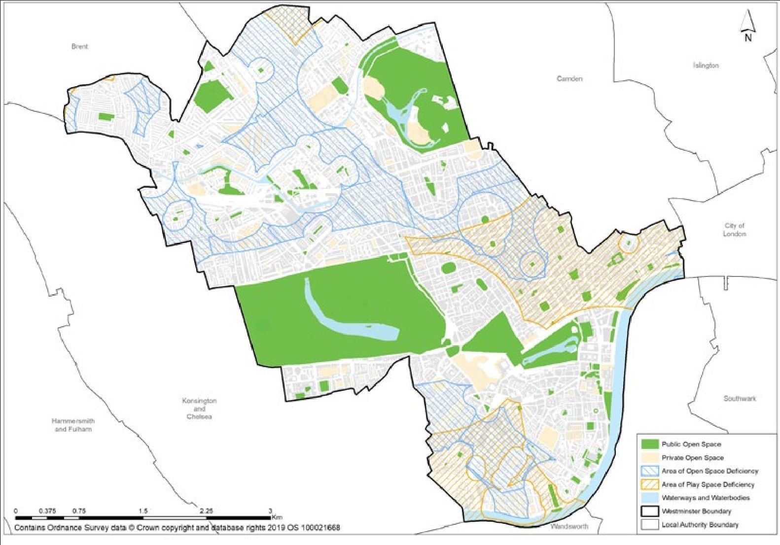 The City Plan protects all existing open spaces. Whilst the Royal Parks are a huge asset, and they cover 19% of the city, not every resident in Westminster has close access to public open space. Figure 5 demonstrates the extent of open space deficiency11 in our densely populated and urban city that has gone through ecological decline in previous decades.