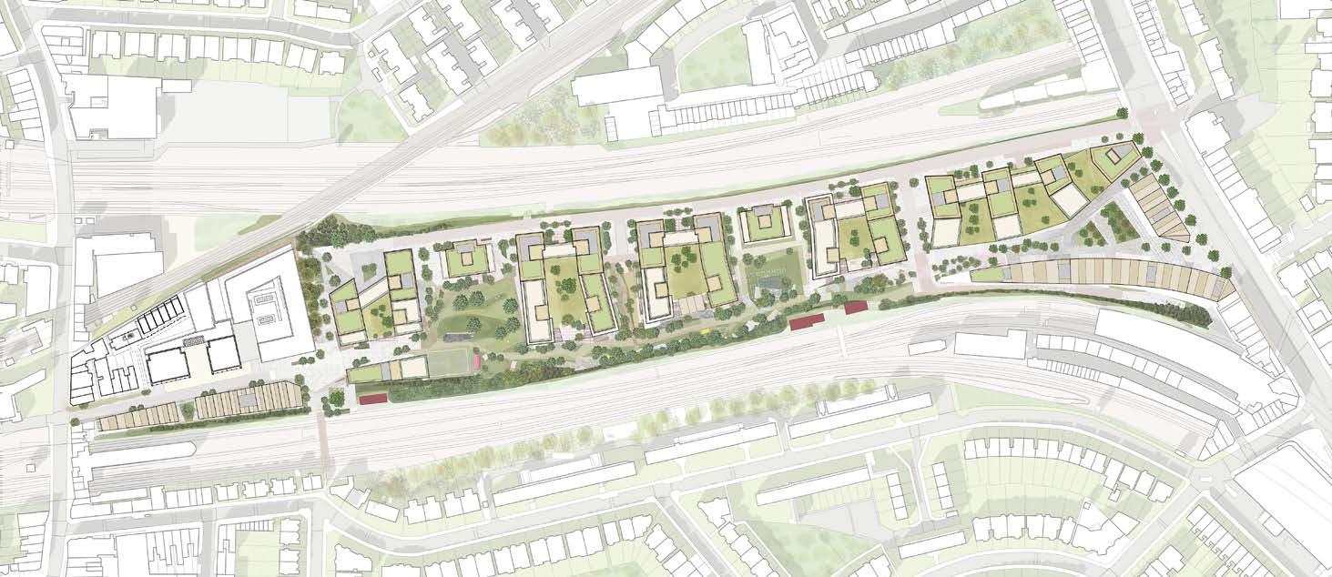 A new 0.64ha linear park creating an enhanced pedestrian and cycling connection between Finchley Road and West Hampstead