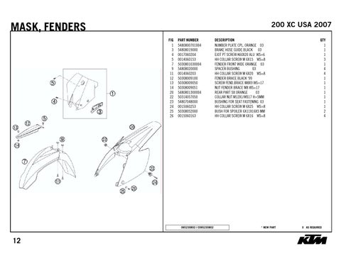 DESCRIPTION NUMBER PLATE CPL. ORANGE 03 BRAKE HOSE GUIDE BLACK 03 EJOT PT SCREW K60X20 ALU WS=6 HH COLLAR SCREW M 6X15 WS=8 FENDER FRONT WIDE ORANGE 03 SPACER BUSHING 03 HH COLLAR SCREW M 6X20 WS=8 FENDER BRACE BLACK '99 SCREW FEND.BRACE M8X9 WS=17 NUT FENDER BRACE M8 WS=17 REAR PART SX ORANGE 03 COLLAR NUT M12X1/WS17 H=5MM BUSHING FOR SEAT FASTENING 03 HH COLLAR SCREW M 6X25 WS=8 BUSH FOR SPOILER 6X11X16X5 MM HH COLLAR SCREW M 6X16 WS=8