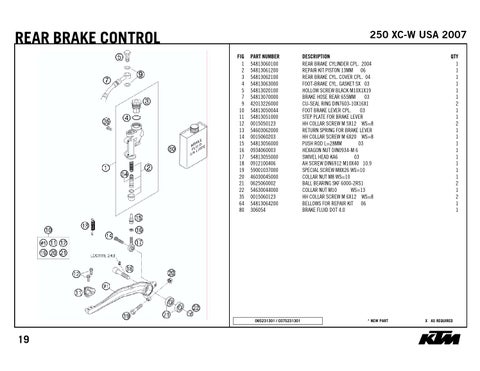 DESCRIPTION REAR BRAKE CYLINDER CPL. 2004 REPAIR KIT PISTON 13MM 06 REAR BRAKE CYL. COVER CPL. 04 FOOT-BRAKE CYL. GASKET SX 03 HOLLOW SCREW BLACK M10X1X19 BRAKE HOSE REAR 655MM 03 CU-SEAL RING DIN7603-10X16X1 FOOT BRAKE LEVER CPL. 03 STEP PLATE FOR BRAKE LEVER HH COLLAR SCREW M 5X12 WS=8 RETURN SPRING FOR BRAKE LEVER HH COLLAR SCREW M 6X20 WS=8 PUSH ROD L=28MM 03 HEXAGON NUT DIN0934-M 6 SWIVEL HEAD KA6 03 AH SCREW DIN6912 M10X40 10.9 SPECIAL SCREW M8X26 WS=10 COLLAR NUT M8 WS=10 BALL BEARING SKF 6000-2RS1 COLLAR NUT M10 WS=13 HH COLLAR SCREW M 6X12 WS=8 BELLOWS FOR REPAIR KIT 06 BRAKE FLUID DOT 4.0
