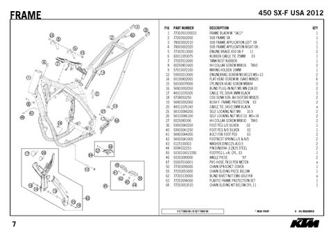 DESCRIPTION FRAME BLACK M. "JA11" SUB FRAME SX SUB FRAME APPLICATION LEFT 08 SUB FRAME APPLICATION RIGHT 08 ENGINE BRACE 450 SX-F 11 RUBBER CABLE TIE 75MM 03 TANK REST RUBBER HH COLLAR SCREW M8X16 TX40 WIRING HOLDER 16MM ENGINEBRAC.SCREW M10X123 WS=13 FLAT HEAD SCREW M. ISA45 M8X20 CYLINDER HEAD SCREW M8X44 BLIND PLUG-IN NUT M5 WN 22A 03 CABLE TIE 300/4,8MM BLACK COU.SUNK SCR. AH ISO7380 M5X25 BUSH F. FRAME PROTECTION 03 CABLE TIE 140/2,5MM BLACK SELF LOCKING NUT M8 10.9 SELF LOCKING NUT M10 CU WS=14 HH COLLAR SCREW M8X30 TX40 FOOT PEG L/S SILVER 02 FOOT PEG R/S SILVER 02 BOLT FOR FOOT PED 03 FOOTREST SPRING L/S & R/S WASHER DIN0125-A10,5 PIN DIN0094-3,2X25 STEEL FOOTPEG L.+R. CPL. 03 ANGLE PIECE '97 PVC-HOSE 7X10 PER METER CHAIN SPROCKET COVER CHAIN SLIDING PIECE BELOW BLIND RIVET NUT EM6-60LF/HX PLASTIC FRAME PROTECTION SET CHAIN SLIDING KIT BELOW CPL.11