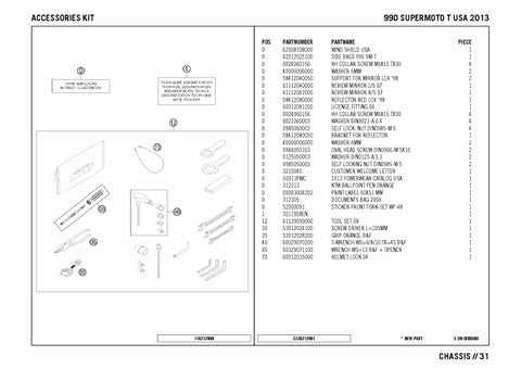 PARTNAME WIND SHIELD USA SIDE BAGS 990 SM-T HH COLLAR SCREW M6X15 TX30 WASHER 6MM SUPPORT FOR MIRROR LC4 '98 REVIEW MIRROR L/S 07 REVIEW MIRROR R/S 07 REFLECTOR RED LC4 '98 LICENCE FITTING 06 HH COLLAR SCREW M6X15 TX30 WASHER DIN9021-A 6,4 SELF LOCK. NUT DIN0985-M 6 BRACKET FOR REFLECTOR WASHER 6MM OVAL HEAD SCREW DIN0966-M 5X16 WASHER DIN0125-A 5,3 SELF LOCKING NUT DIN0985-M 5 CUSTOMER WELCOME LETTER 2013 POWERWEAR CATALOG USA KTM BALLPOINT PEN ORANGE PRINT LABEL 60X51 MM DOCUMENTS BAG 2006 STICKER FRONT FORK-SET WP 48 TOOL SET 08 SCREW DRIVER L=105MM GRIP ORANGE B&F T-WRENCH WS=6/8/10 TX=45 B&F WRENCH WS=13 B&F + OPENER HELMET LOCK 04