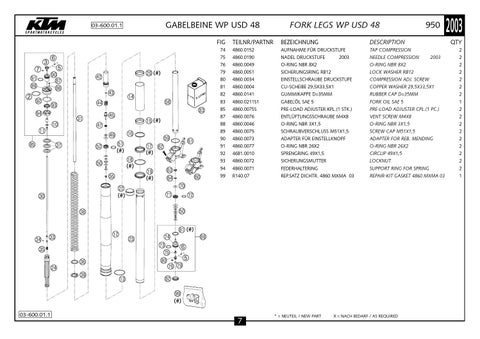 TAP COMPRESSION NEEDLE COMPRESSION 2003 O-RING NBR 8X2 LOCK WASHER RB12 COMPRESSION ADJ. SCREW COPPER WASHER 29,5X33,5X1 RUBBER CAP D=35MM FORK OIL SAE 5 PRE-LOAD ADJUSTER CPL.(1 PC.) VENT SCREW M4X8 O-RING NBR 3X1,5 SCREW CAP M51X1,5 ADAPTER FOR REB. MENDING O-RING NBR 26X2 CIRCLIP 49X1,5 LOCKNUT SUPPORT RING FOR SPRING REPAIR-KIT GASKET 4860 MXMA 03