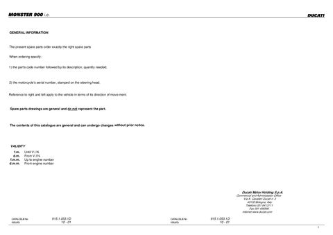 Ducati Motor Holding S.p.A. Commercial and Administation Office: Via A. Cavalieri Ducati n. 3 40132 Bologna, Italy Telefono 051 6413111 Fax 051 406580 Internet www.ducati.com CATALOGUE No: ISSUED: