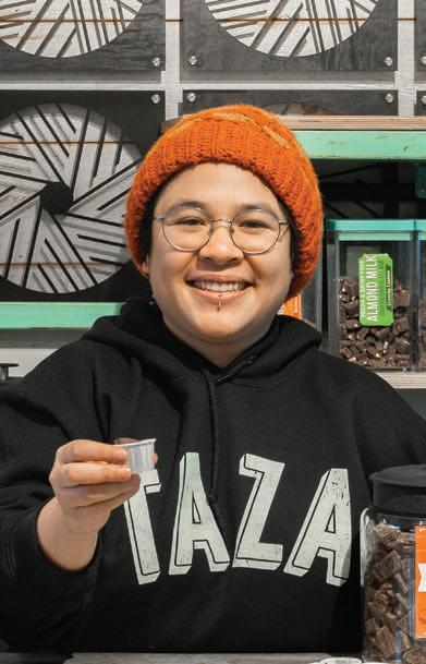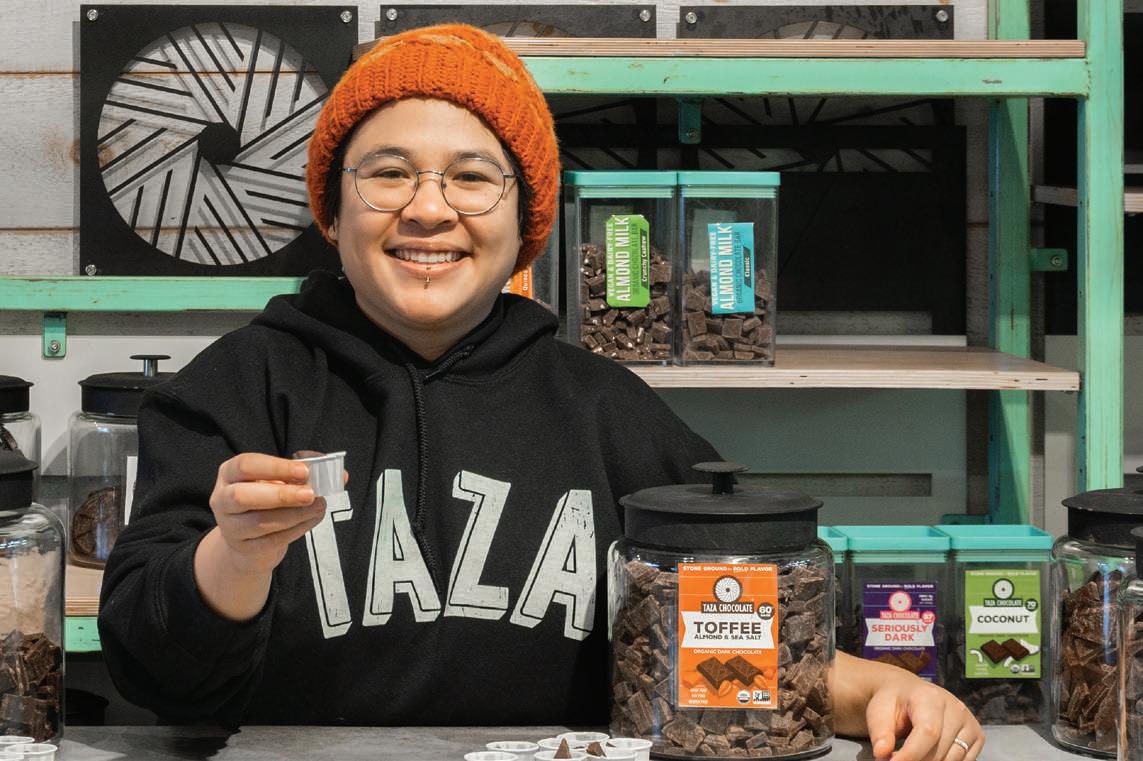 o children have ever been lost in a chocolate factory,” at least as far as Chris Vistro knows, and certainly none on their watch at Taza Chocolate, despite what Roald Dahl would have you believe. Between graduating from Commonwealth in 2009 and Taza, Chris “ended up in all sorts of weird places,” like spending nine months in the woods of North Carolina WWOOFing, aka working on homesteads through World Wide Opportunities on Organic Farms. After returning to Boston, they started at Taza in 2015. Today, as Director of Retail and Administrative Operations, Chris oversees Taza’s factory store, tour program, customer-service team, offsite events, and more, with no Oompa Loompa assistance whatsoever.