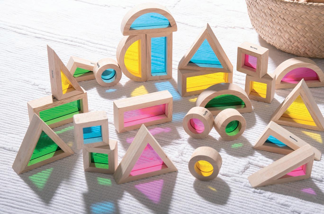 Smooth rubberwood shapes with double-sided acrylic mirror inserts. Made to promote simple shape recognition, early tactile hands-on construction and curiosity.