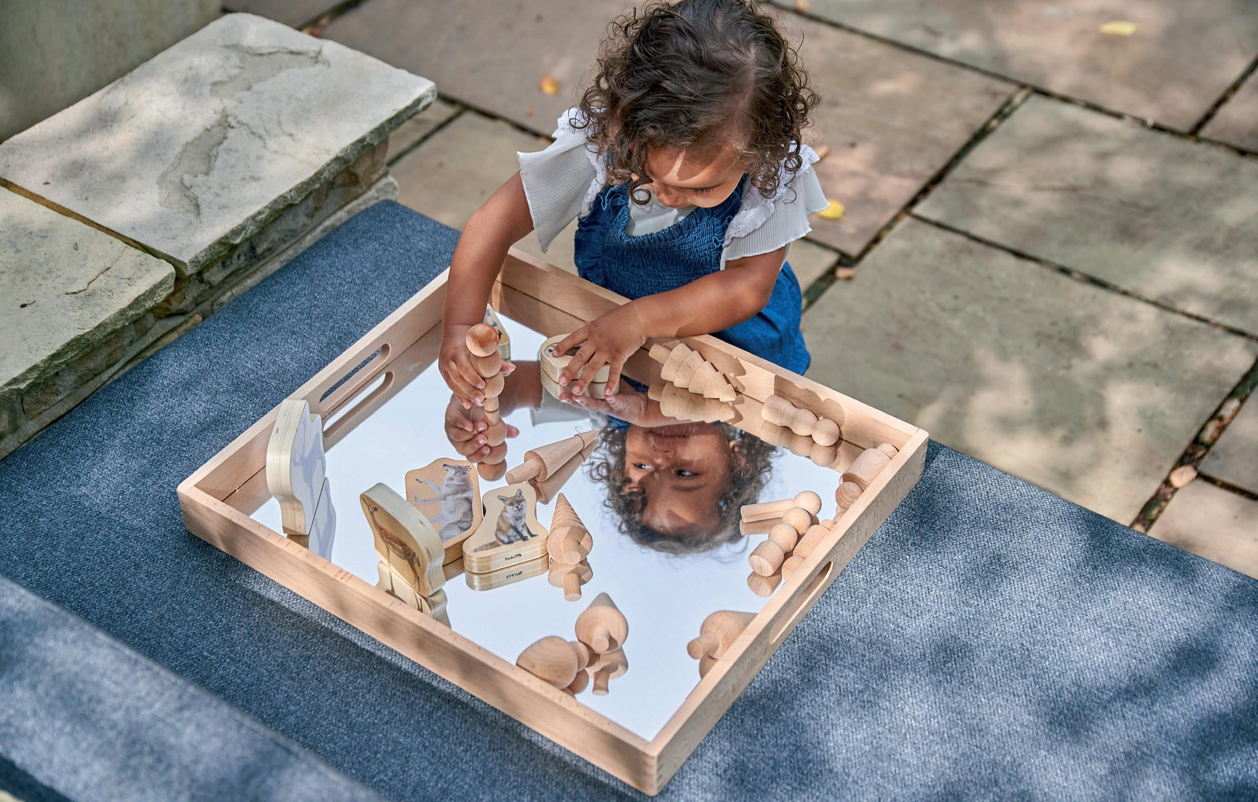 Our solid beechwood mirror tray is ideal for children to learn about reflection and mirror effects, to closely inspect interesting objects, for use in imaginative play and to create small world environments. The solid construction provides a stable base for the 2mm acrylic mirrored base, providing a sharp clear bright reflection.