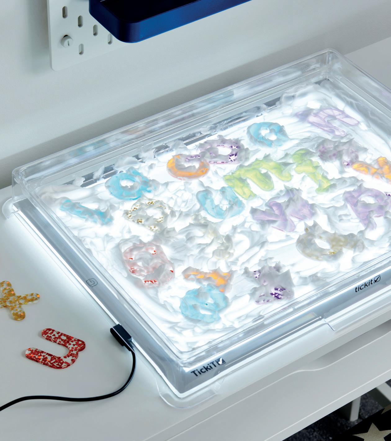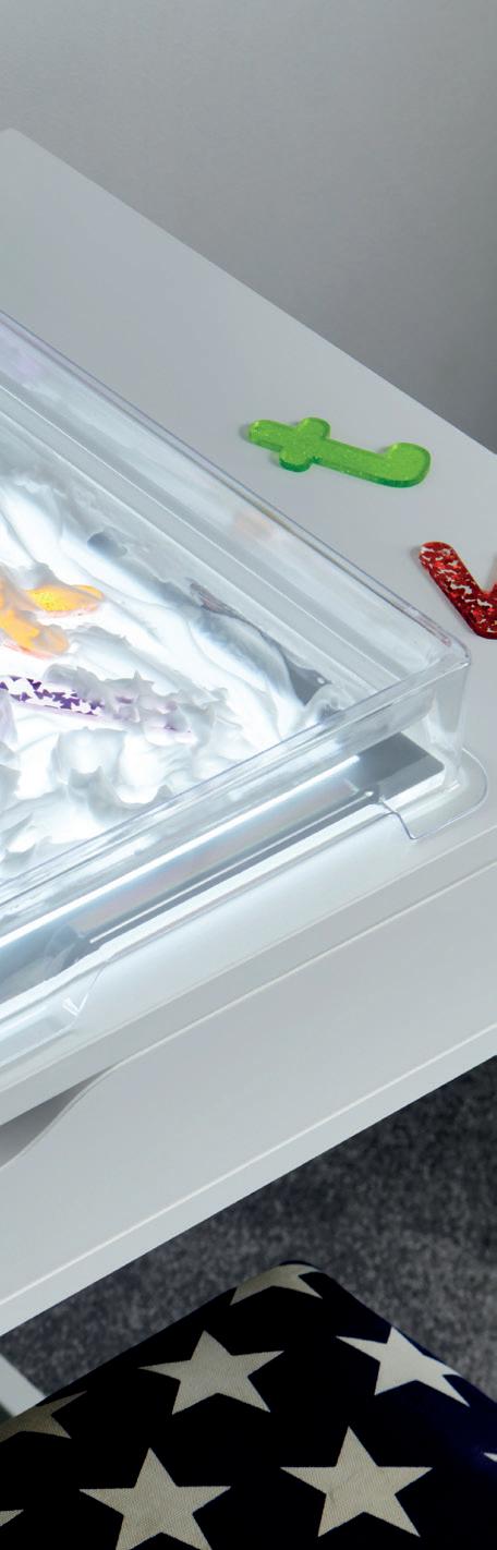 • Stellen Sie eine transparente Wanne mit farbigem Dekosand auf die Leuchtplatte, in dem die Kinder Handschriftmuster, Buchstaben, ihren Namen und ganze Wörter üben können.