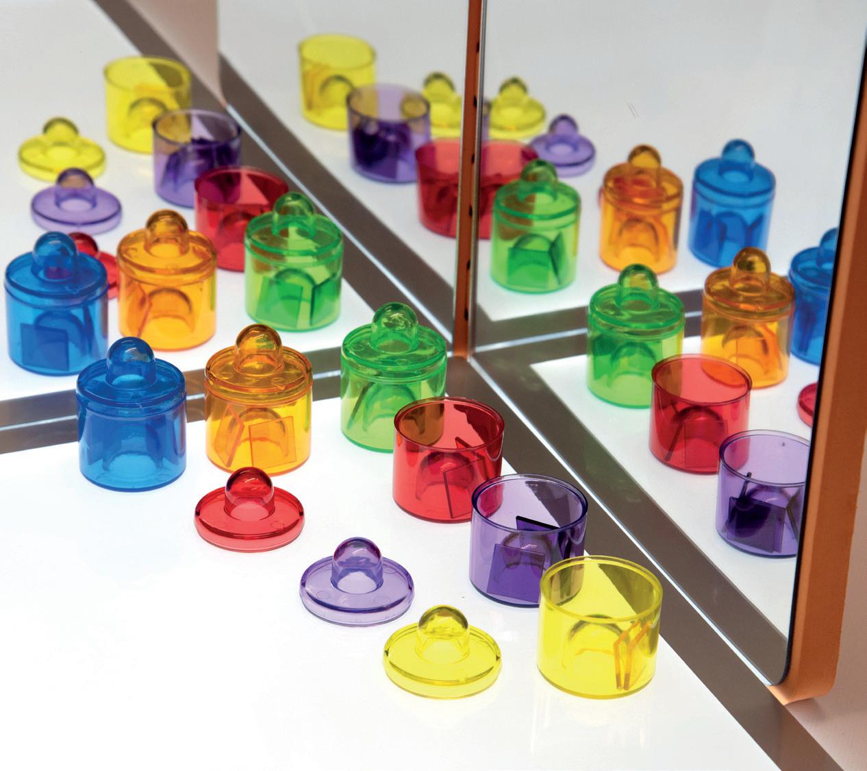• Utilizar el conjunto de Perception Semispheres con una gama de objetos pequeños sobre un panel de luz animará a los niños a pensar de manera creativa. Las semiesferas transparentes de brillantes colores se pueden colocar sobre los objetos, tanto para cambiar su color como para aumentar su tamaño.