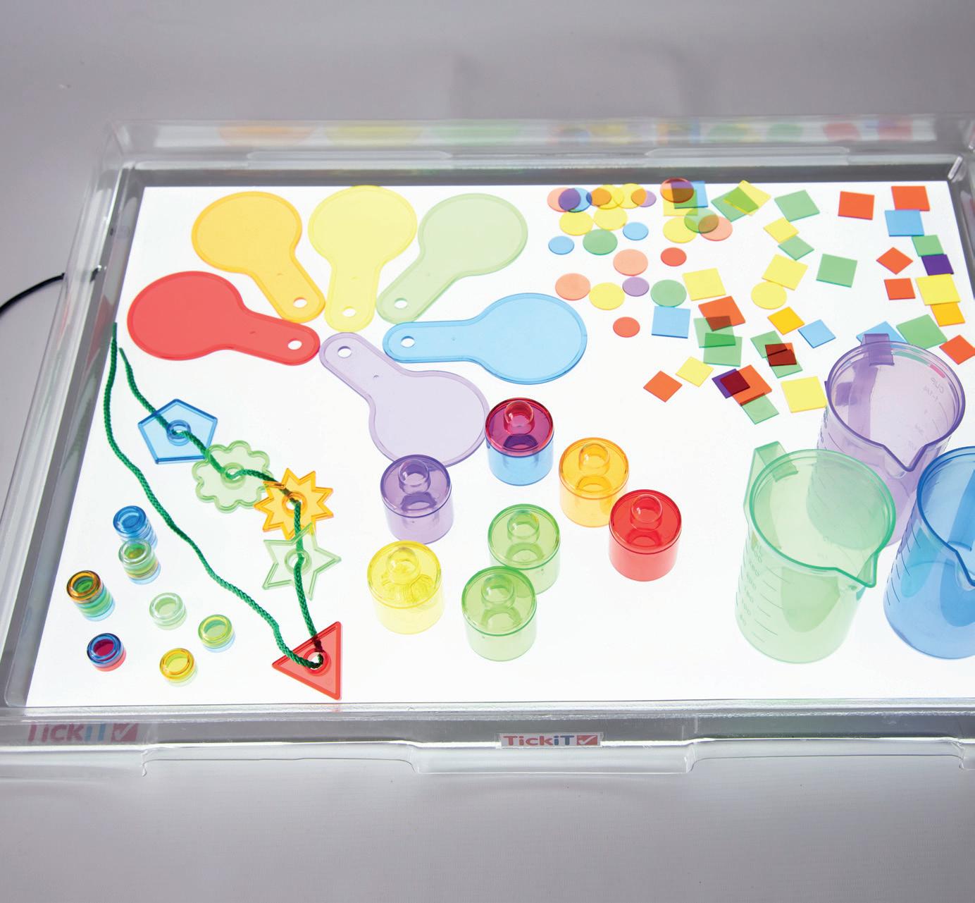 • Ofrece diversos recursos, tales como Colour Paddles, SiliShapes, fichas, materiales naturales y recuperados. Utilizados sobre un panel de luz, ofrecerán un punto inicial para hablar a los niños sobre colores, luz, transparencia, translucidez y opacidad.