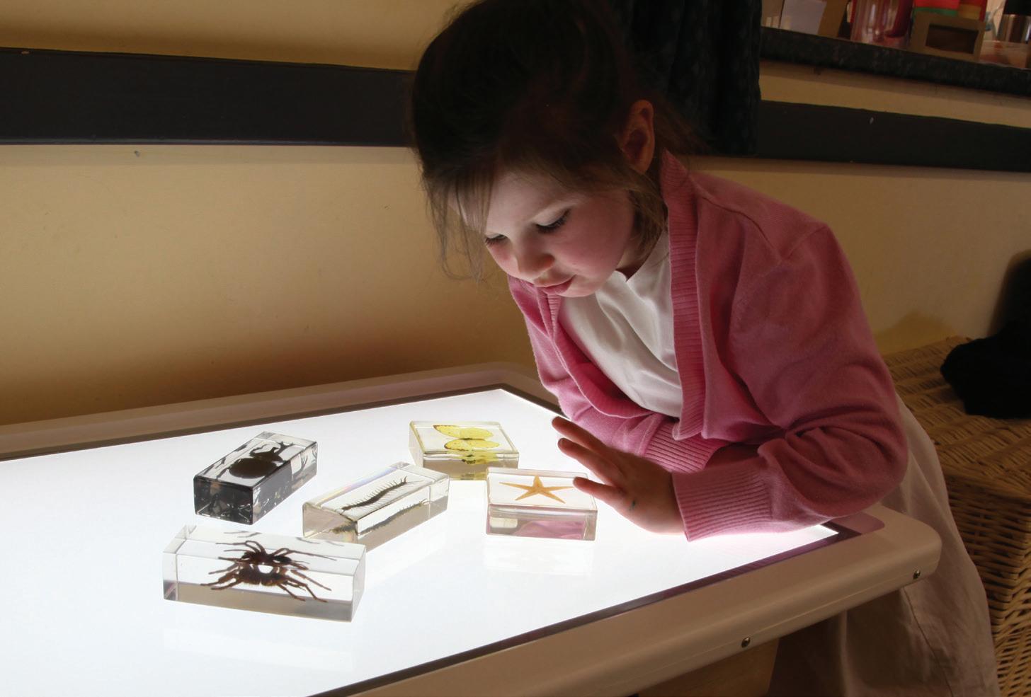 • Use a clear cantilevered artist’s box to display translucent, transparent and opaque objects. Buttons, beads, shapes, glass nuggets, stones, shells, small bottles and papers can all be provided to encourage children to develop their creativity through exploring the things of beauty on a light panel.