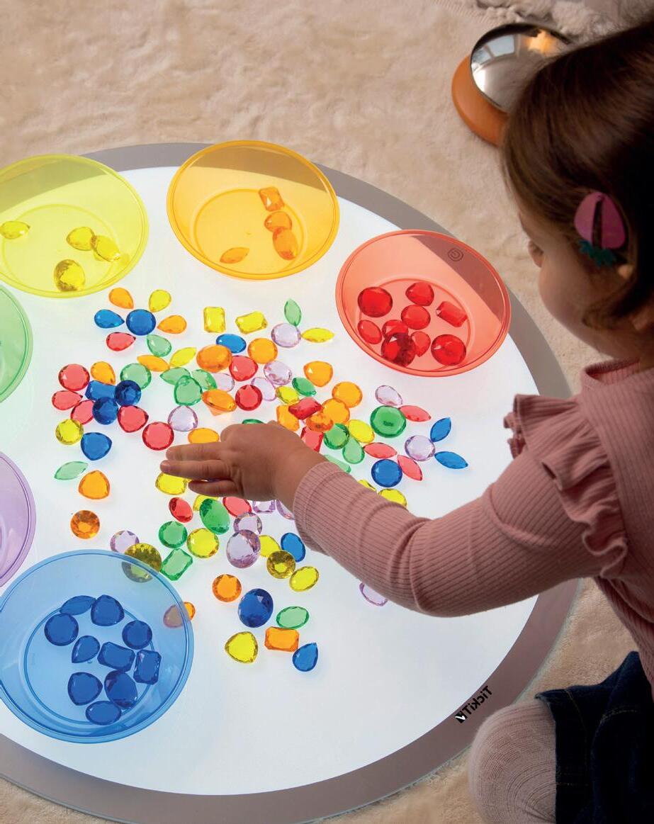 • Using a range of resources on a light panel is a perfect way of interesting children in counting and numbers. Using brightly coloured translucent resources on a light panel is an attractive and compelling activity and children will delight in learning to count using them.