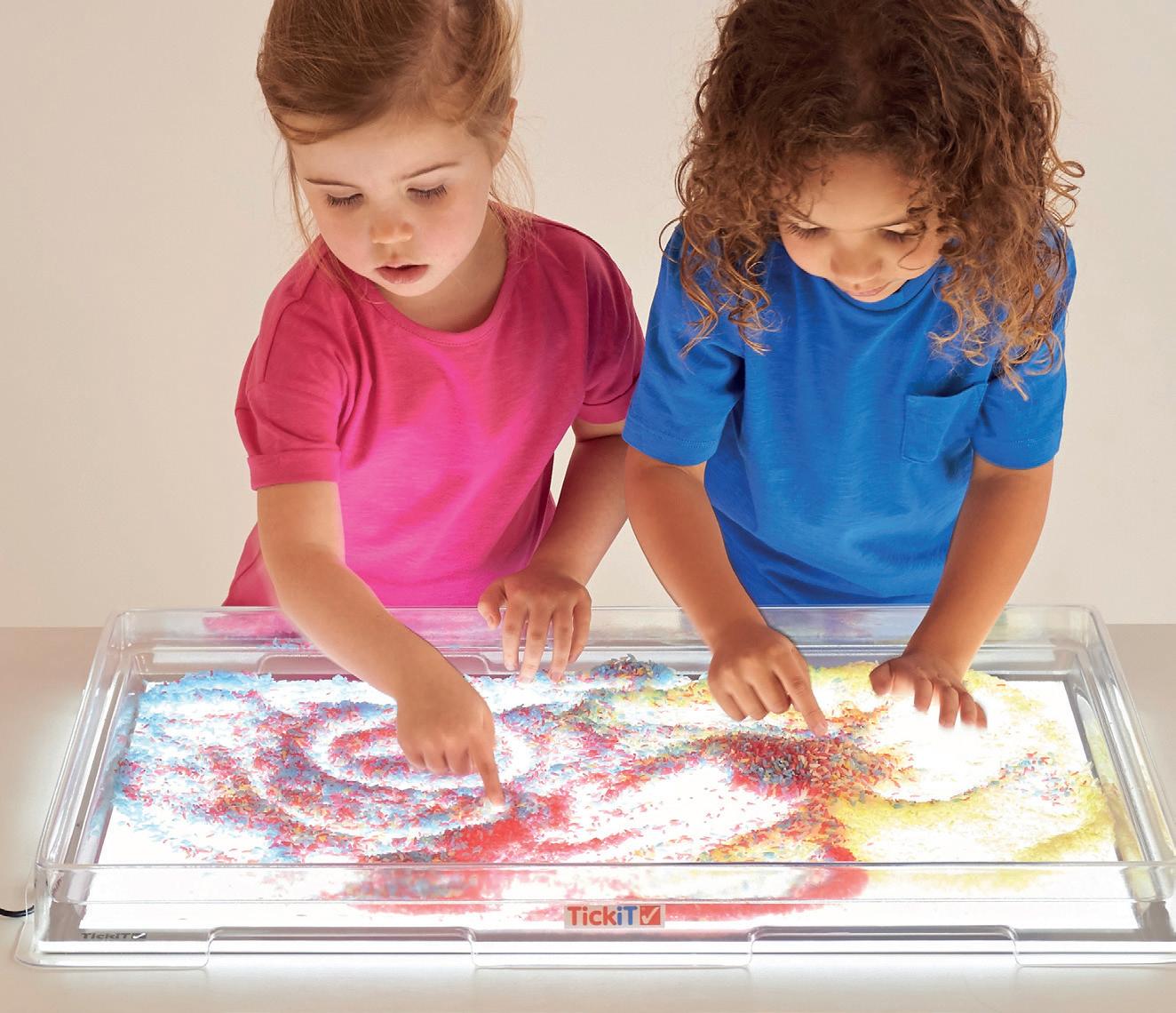 • Encourage early mark making and picture making by providing children with ‘waves’ of coloured sand on a clear tray on the light panel.