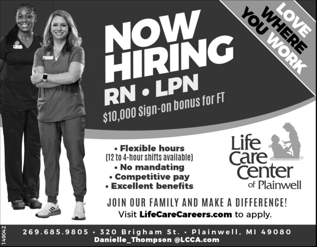 Thank You! m to complete an online application Referral Bonus 20.00 p e r h o u r Recruiting firm with professional, technical and temporary divisions. A P P LY T O D AY ! 134 W. Allegan Street • Otsego (269) 692-2478 G R EAT JOBS I N SOUTHWEST M IC H IGAN! • Assembly • CNC Machining • Machine Operation S E R V I N G T H I S A R E A S I N C E 1 9 5 5 8004 DOUGL AS COOP ER CENTER (269) 343 5147 or 343 0252 Hours: Mon Fr i 7:00am 5:00pm C O U P O N C O U P O N SLEEMAN’S AUTO CENTER Our Mechanics have Over 75 YEARS comb ned Au o Exper ence! Oil, Lube & Filter $3 4 95 Includes: 21 point safety inspection Plus $3 00 environmental fee Conventional oil for most vehicles Up to 5 quarts Appointment Recommended WITH COUPON Home Improvement Roofing: Licensed Builder Farmer Construc tion Free estimates, call 269 352 8881 West Michigan Glass Concepts, LLC, 116 E Allegan St , Otsego 269 694 1611 For all your glass needs, same day glass replace ment! www samedaywindowrepair com P R ICE R EDUCED! 2 White Vinyl Double hung replacement windows 35 5”w x 53 75”l $100 each 1 white vinyl double hung replacement window 35 5”w x 37”l $75 Great condition! Call (269)370 9469 Handy Man Services offered: Insured, qual ity work Construction, roofing, plumbing, more Free estimates 269 213 6430 American Standard Walk In Tubs Buy from a brand you trust Patented Quick Drain® technolog y 44 hydrotherapy jets Lifetime warranty on tub and installation! Free in home consultation at your convenience Limited time offer $1,500 in savings in cludes a F R EE right height toilet Call 1 833 591 1961 Jeffrey B Hoy t, Builder, (269)760 0035 All your building needs, no job too big or small Licensed/insured Senior discount Now Scheduling! Leaf removal and cleanup, gutter cleanouts and all types of snow plow ing and removal (269)680 1550 or email Ennservices49080@yahoo com Replace Your Roof With the best looking and longest lasting material steel from Erie Metal Roofs! Three styles and multiple colors available Guaranteed to last a lifetime! Lim ited Time Offer $500 Discount + Additional 10% off install (for military, health workers & 1st responders ) Call Erie Metal Roofs: 1 888 718 1856 Metal Roofing Regular and shingle style, Half Off On Special Colors! Also, lifetime as phalt shingles available Licensed and in sured builders Pole Buildings Quality work for 40 years! Amish Crew! 517 575 3695 Amish Built Storage Sheds and mini cabins delivered to your site anywhere in Michigan! Star ting at $2,500 00 mynextbarn com 989 832 1866 Eliminate Gutter Cleaning Forever! LeafFil ter, the most advanced debris blocking gut ter protection Schedule a F R EE LeafFilter es timate today 15% off Entire Purchase 10% Senior & Military Discounts Call 1 844 369 2501 Safe Step Nor th America’s #1 Walk In Tub Comprehensive lifetime warranty Top of the line installation and service Now featur ing our free shower package and $1600 Off for a limited time! Call today! Financing available Call Safe Step 1 866 319 1374 Built Best Barns Best quality, best service Now in our 25th year! Over 4,000 buildings in mid Michigan Call for quotes Licensed/Insured 989 205 2534 Amish Log Beds, Dressers, Rustic Table and Chairs, Mattresses for Cabin or Home Low est price in Michigan! 989 923 1278 dandanthemattressman com Items For Sale 9 Foot Christmas Tree, ar tificial, balsam pine, pre assembled $150 firm Call (269)345 3527 Free Spinet Piano, small size, good shape You move it Nor thwest Kalamazoo area (269)569 6047