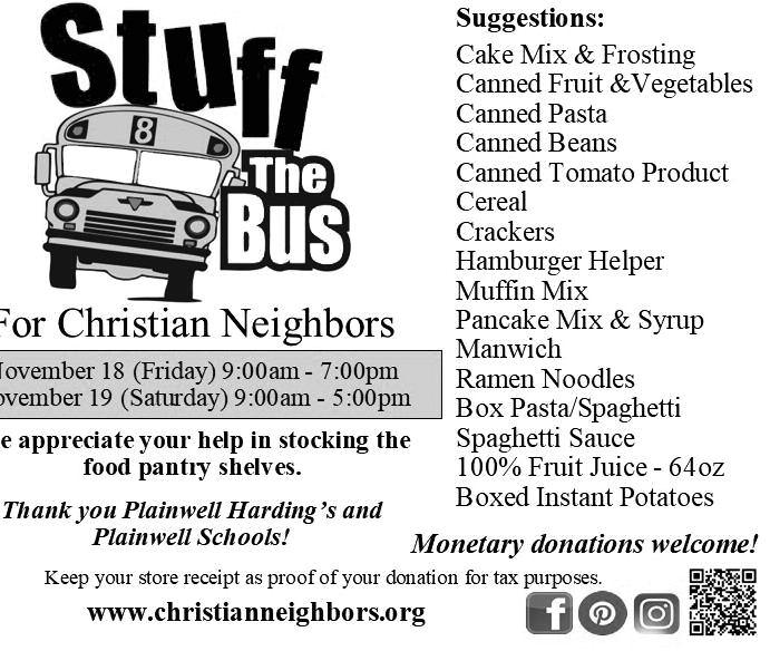 COMPANION Animal Veterinar y Clinic, Inc. 2 0 1 E B R I D G E S T , P L A I N W E L L • ( 2 6 9 ) 6 8 5 5 4 8 4 Sponsored by Community Page Community Page shoppersguide@sbcglobal.net or (269) 694-9431 info@communityshoppersguide.net or call 269 694 Friday November 18 9:00am -7:00pm Saturday November 19 9:00am-5:00pm We appreciate your help in stocking the food pantry shelves! THANK YOU Plainwell Harding’s & Plainwell Schools! For Christian Neighbors F R EE Annual Christmas Room coming soon! Parents and grandparents can choose new or gently used g ifts for chil dren Free clothing and household items always available Open Tuesdays (10am