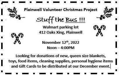 Plainwell Volunteer Christmas Project: Enrollment forms available at the following locations: Plainwell City Hall, Christian Neighbors, Ransom District Library, and all school offices Must reside in the Plainwell school district Deadline to enroll November 18th Email plainwellchristmas@yahoo com or call (269)666 4442