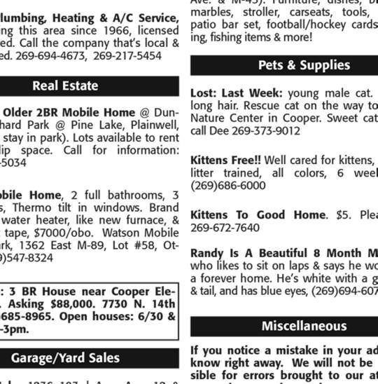 If you notice a mistake in your ad, let us know right away We will not be responsible for errors brought to our attention over 7 days past the run date