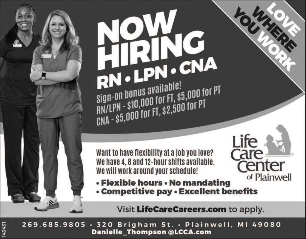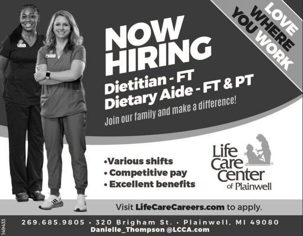 COMMUNITY SHOPPERS GUIDE OTSEGO, MI 49078 June 10, 2023 Phone 694-9431 Tim Andrus AAMS Financial Advisor 113 E Allegan St Otsego, MI 49078 269-692-2280 By appointment on y Ginger Titus CFP®, AAMS Financial Advisor 711 E Allegan St Otsego MI 49078 269-694-1548 By appo ntment only Morgan Yaw CFP®, AAMS Financial Advisor 101 S Ma n St Plainwell MI 49080 269-685-1181 By appo ntment on y edwardjones com Member SIPC Worried about your retirement savings? We can help. S e r v ic e Yo u C a n Tr u s t - S in c e 1 9 8 0 ! 1437 E. M-89 • OTSEGO (269) 694-9879 MONDAY-FRIDAY 8AM-5PM WE ARE ALWAYS ACCEPTING NEW CUSTOMERS! IL CHANGE • TIRES • BATTERIES • TRANSMISSION • A/C REPAIR • EXHAUST • USED ENGINES • FRONT END ALIGNMENTS • FULL ENGINE REPAIRS www.harring tonauto.com AR E YOU COOL E NOUG H TH IS SU M M E R? C O U P O N $20 00 O F F A/C Refill Expires: 6/30/23 Some restr ctions apply Cannot be combined w th any other coupon or specia s WE CARRY MOST Major Brands of TIRES FREE L i fe t i m e T i r e R o t a t i o n with purchase of a set of 4 tires CLEARANCE LIQUIDATION WHILE SUPPLIES LAST After The Sale It’s The Ser vice That Counts! Monday-Friday 8-5, Saturday 9-1 26TH AT M-89 • ALLEGAN • 269-673-8736 IfItDoesn’tSay Joe’s YouPaidTooMuch! www JoesLawnandGarden com Al sale pr ces are cash pr ce Cred card and financ ng fees could affect price See dealer for deta ls While suppl es last Was $3,299 $2,9 9 9 Zero Turn Z246 20HP Endurance V-Twin Heavy Duty Reinforced Deck 10 Year Limited Warranty Was $3,595 $3,19 9 Zero Turn Z254 Kohler 7000 Twin Engine 15” seat, 6 5mph Greasable Mowing deck 54” HD Deck 10 Year Limited Warranty $5,395 Zero Turn MZ-61 61” Fabricated Deck 27hp Endurance 4 Year Limited Warranty FREE Deliver y in Southwest Michigan! 3 Left! 4 Left! 6 Left! PERSONAL INSURANCE SALES BShearer@nulty.com HOME • AUTO • LIFE NULTY INSURANCE 354 W Allegan Street Otsego, MI 49078 nulty com P l a i n w e l l , M I Services