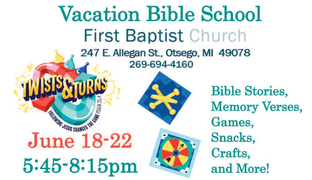COMMUNITY SHOPPERS GUIDE OTSEGO, MI 49078 June 17, 2023 Phone 694-9431 Making Waves for Jesus YOU ARE INVITED TO VACATION BIBLE SCHOOL June 20-23, 2023 • 6:00PM-8:30PM Otsego SDA Church 218 S. Farmer St. Otsego, MI 49078 Register Early: myvbs.org/MissionCruise A Volunteer will meet you For financial requests please call 269-694-9005 and leave a messag e Mon 1:00pm-3:00pm; Tues & Thurs 10:00am-12noon; Wed 3:00pm-5:00pm St Vincent de Paul is able to ser ve Otsego, Plainwell and Mar tin School distr icts only 134A W. Allegan Street • OTSEGO 269-694-9005 EMAIL: stvincentdepaul9005@gmail com Currently Curbside Service Only. FOOD AND LIMITED FIN ANCIAL ASSIS TANCE AVAIL ABLE FOOD PANTRY S T. VINCENT DE PAUL Thank you & God Bless DON ATIONS WELCOME! AT THE PANTRY, BY MAIL OR ON OUR WEBSITE www.stvincentdepaulministry.org Donate $10.00 Plainwell/Otsego Meijer will match it! SATURDAY, JUNE 17 Meijer will Double Match your donation! On this day your $10