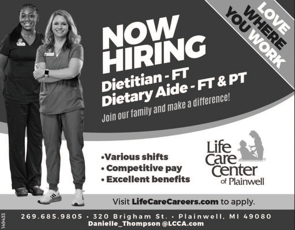 COMMUNITY SHOPPERS GUIDE OTSEGO, MI 49078 June 17, 2023 Phone 694-9431 Jeremy Weitting, Agent State Farm Agent 911 Dix Street, Suite A Otsego, MI 49078 Bus: 269-692-6831 1706478 Your financial health is about a lot more than insurance That’s why State Farm Bank® makes it easy to manage your money too, with 24/7 online banking at statefarm com® Ask me about Checking accounts, Money Market Savings accounts and more CALL ME TODAY State Farm Bank F S B B oomington IL Your good neighbor for banking too. M 1211-B M-89 P LAI NW E L L (NEXT TO BURGER KING) REE huttle rvice www.proautomotiveplainwell.com OPEN MON -FRI 7:30AM-5:00PM Est 2009 (269) 685-5700 New: 3 yr/100,000 mile Used: 2 yr/24,000 mile We Install NEW & USED ENGINES AND TRANSMISSIONS WE SE RVIC E MOST AF TE R MAR KET WAR R ANTI ES! GET YOUR A/C FIXED NOW! LLC . 10% Veteran & Senior Discount KEEP COOL THIS SUMMER! L a b o r o n A / C R e p a i rs Must present coupon Expires 6/30/23 Not valid with any other offers or coupons LLC 10% OFF $7 BIN MONDAY 10am-5pm SMART & SIMPLE DISCOUNTS Open 9am-5pm Every Friday & Saturday 114 S. Farme n o 6 9-6 94-1771 Charcoal 8 lb bag $2.99 Boots Ladies size 11 only $6.99 Pure Life Bottled Water Case of 40 $5.99 2 piece Bath Towel Sets $10.00 Clorox Disinfecting Wipes 3 packages for $1.00 $12 BIN FRIDAY 10am-5pm $10 BIN SATURDAY 10am-5pm CLOSED SUNDAY! COMING SOON! The Bin Store! $3 BIN TUESDAY 10am-5pm $1 BIN WEDNESDAY 10am-5pm STARTING FRIDAY, JUNE 30! Open 5 Days per week! Thursday CLOSED to Restock! Day of Rest! COMING SOON! The Bin Store! HELP WANTED Star ting pay $12.00 PER HOUR • Sales • Cashiers • Stocking • Maintenance 9am-5pm - 5 Days per week Send Resume to: kennyz@generalws com or call (248) 379-3484 AN AUTHORIZED DEA KALAMAZOO, MI 49009 2 6 9 - 6 9 4 - 9 0 0 0 www 1prowater com 34 Years Experience in the Water Treatment Industry Pro Water Treatment Specializes in Reverse Osmosis Service Are You Concerned About Your Drinking Water? Are You Concerned About Your Drinking Water? Reverse Osmosis is capable of removing up to 99%+ of water contaminants PERSONAL INSURANCE SALES BShearer@nulty.com HOME • AUTO • LIFE NULTY INSURANCE 354 W Allegan Street Otsego, MI 49078 nulty com Looking for extra cash this summer? W ant to get paid to exercise? The Shoppers Guide has a route available! Plainwell Walking Paper Route With Small Driving Area Approx 2-1/2 hours per week $100-125 per month Must have reliable car/truck & working phone. No age requirement Deliver y needs to be done between 6am Fridays - 12noon Saturdays, ever y weekend Apply in person at the Community Shoppers Guide, downtown Otsego or apply online at: communityshoppersguide net www.theantennamen.com antennamen@gmail.com 269-967-8241 • Digital TV Antennas • Towers • Cell Phone Boosters P l a i n w e l l , M I Miscellaneous Let Your Favorite Business Know you saw their ad in the Shoppers Guide Shop local! Viagra and Cialis Users! 50 generic pills special $99 00 Free shipping! 100% guaranteed 24/7 Call now! 888-835-7273 Hablamos Espanol Dish Network: Only From Dish- 3 year T V Price Guarantee! 99% Signal Reliability, backed by guarantee Includes Multi-Spor t with N F L Redzone Switch and