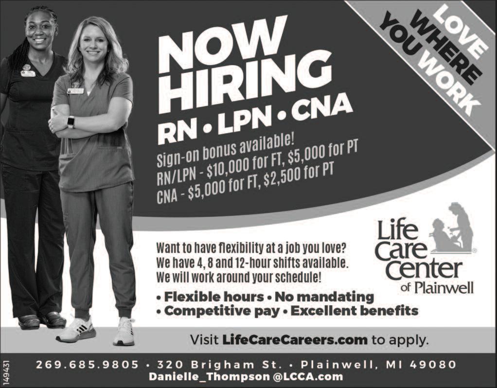 Watercraft Star Craft Fishing Boat 2022: New 14’ aluminum, 9 9 4-stroke outboard, electric star t, trailer Just $9650! Kooper’s Marine, Richland (269)629-4979 Pets & Supplies AKC Reg. Cocker Spaniel Pups, New big litters! 50% Off! Shots and wormed 920-563-3410 mornings (#268588) HELP WANTED Garage Sales Garage Sale - June 9, 9-5 June 10, 9-? 1022 Wedgewood Drive, Plainwell at Wedgewood Condos Home decor, furniture, seasonal items, some men’s and women’s clothing, misc Garage Sale, Multi-family Saturday, June 3, 8am to 3pm 1696 Sycamore Street, Otsego Large assortment of items! Recreational Pop-up Camper Trailer: $500 or best offer (269) 249-8672 Benning ton Pontoon: 20 ft w/Cruise Package 40H P Honda w/4-stroke power tilt New Aqualon cover, low hours Just $12,500 Kooper’s Marine, Richland (269)629-4979 CL ASSI F I ED DEADLI N E: TH U RSDAYS 3:30PM DISP L AY AD DEADLI N E: WE DN ESDAY 5:00PM www communityshoppersguide net Check out our new website! View the paper online, place a classifed, and much more! 320 Brigham St. • Plainwell, MI 49080 LifeCareCareers.com Call Carol Lindauer at 269.685.4303 for more details. LIFE CARE CENTER OF PLAINWELL 1 4 9 8 0 3 Now Hiring: Beautician This is a contract position for 1–2 days per week. Must be a licensed beautician. Inspire . Be inspired.